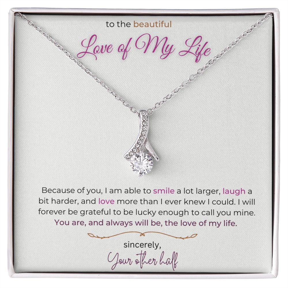 Imagine her reaction when she opens this stunning gift! The Alluring Beauty necklace features a petite ribbon shaped pendant that is sure to dazzle your special someone. Whether it's a birthday or anniversary, make sure to get her a gift she will love for years to come.