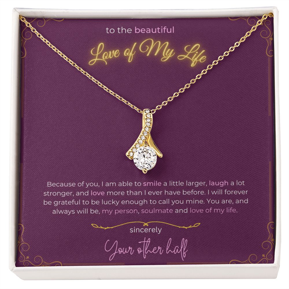 Imagine her reaction when she opens this stunning gift! The Alluring Beauty necklace features a petite ribbon shaped pendant that is sure to dazzle your special someone. Whether it's a birthday or anniversary, make sure to get her a gift she will love for years to come.